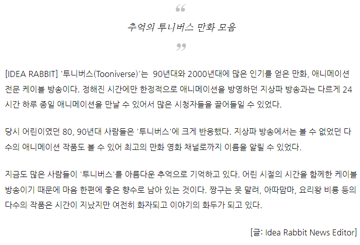작성자브라운푸들 작성시간 22.02.16 안본게 없노….초딩때 진짜 투니버스 보고 싶어서 학원도 안가고 친구집에 숨었음 ㅋㅋㅋㅋㅋㅋㅋ그때 한창 달빛천사할때라