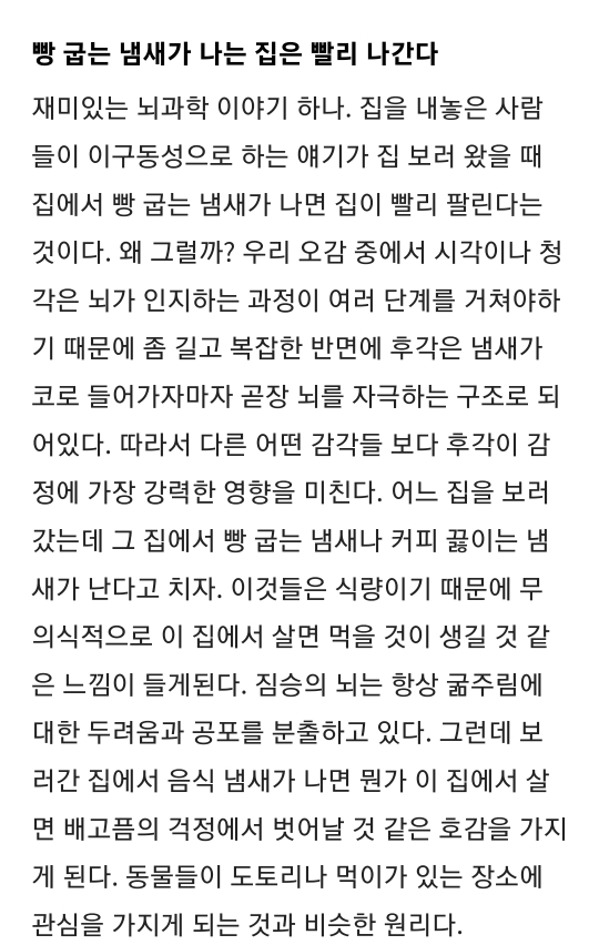 [흥미돋][뇌과학]빵구우면 집 빨리 판다 작성자친화력 좋은 여시|작성시간22.02.19|조회수4,191 목록 댓글 10 글자크기 작게가 글자크기 크게가 출처 [뇌과학]빵구우면 집 빨리 판다https://seroton.tistory.com/m/29[뇌과학]빵구우면 집 빨리 판다이상준 작가 인성교육자존감전문칼럼니스트. 『이타적 자존감수업 』 저자. 빵 굽는 냄새가 나는 집은 빨리 나간다 재미있는 뇌과학 이야기 하나. 집을 내놓은 사람들이 이구동성으로 하는 얘seroton.tistory.com 다음검색 현재 게시글 추가 기능 열기 북마크 공유하기 신고 센터로 신고 댓글 댓글 10 댓글쓰기 답글쓰기 댓글 리스트 작성자10푹곡 | 작성시간 22.02.19 짐승의 뇌... 그러네 작성자로또당첨10번 | 작성시간 22.02.19 헐 세탁소에서 향 좋은커피 내려놓는것도 같은 이친가..? 크린토피아가면 그렇~게 향 좋은 커피 냄새가 나.. 작성자매돌럽 | 작성시간 22.02.19 개웃걐ㅋㅋㅋㅋㅋ 작성자매직스윙 | 작성시간 22.02.19 전에 미드에서 집 보러온다니까 쿠키굽는거 봤는데 ㅋㅋㅋ진짜 있는 얘기구나 작성자미니뭘라이프 | 작성시간 22.04.04 아항 ㅇㅋ 빵.. 밥... 쿠키.. 댓글 전체보기