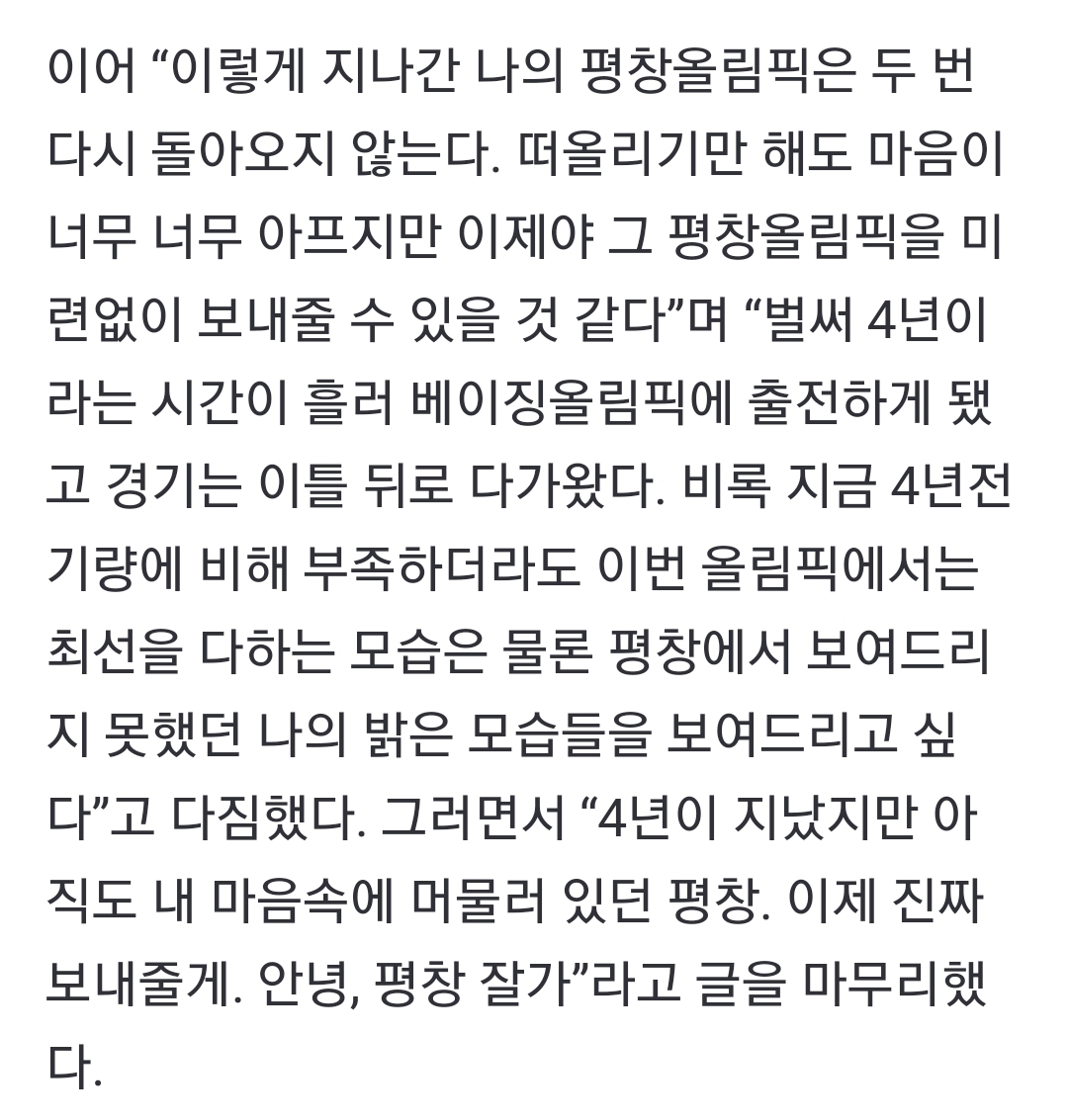 [스크랩] [여시뉴스데스크]김보름, 승소 후 “평창올림픽 미련 없이 보내줄게…위자료 모두 기부” 작성자에푸씨|작성시간22.02.19|조회수5,811 목록 댓글 6 글자크기 작게가 글자크기 크게가 출처 : https://n.news.naver.com/article/023/0003673462김보름, 승소 후 “평창올림픽 미련 없이 보내줄게…위자료 모두 기부”2018 평창 동계올림픽 스피드스케이팅 여자 팀 추월 종목에서 ‘왕따 주행’ 논란에 휩싸였던 김보름(29·강원도청)이 노선영(33·은퇴)을 상대로 청구한 손해배상 소송에서 일부 승소했다. 김보름n.news.naver.com 다음검색 스크랩 원문 : *여성시대* 차분한 20대들의 알흠다운 공간 현재 게시글 추가 기능 열기 북마크 공유하기 신고 센터로 신고 댓글 댓글 6 댓글쓰기 답글쓰기 댓글 리스트 작성자ckid | 작성시간 22.02.19 진짜 대인배같다…ㅠㅠ 작성자앱스토어(느갭 절찬세일중) | 작성시간 22.02.19 보름선수 내막 제대로 알지도 못하고. 평창 때 함부로 말한거 너무 미안해요.. ㅠㅠ 오늘 진심으로 응원할게요 작성자호그와트 마법사 | 작성시간 22.02.19 미안합니다.. 작성자쉬게해주셍 | 작성시간 22.02.19 너무 미안하다ㅠㅠㅠ 작성자따뜻한무관심 | 작성시간 22.02.19 맞아 이 기사보고 너무 속상하고 멋있더라ㅠㅠ 댓글 전체보기