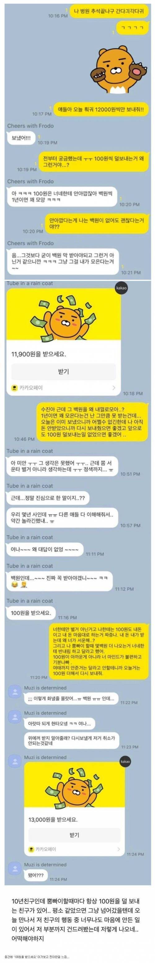답댓글 작성자내일은공부할거야 작성시간 22.02.23 와 소름.. 나 손절한 언니도 꼭 백원단위 자르고 부치는거야.. 한 번은 "실수인가?"생각했는데 매 번, 항상 그렇게 보내길래 모임에 있는 다른 언니한테(내가 막내이고 계좌가 폰번호라 항상 내가 결제하고 엔빵했거든) 저언니가 항상 엔빵하면 백단위 자르고 보낸다. 이거 말해야하나? 이래서 한 번은 다른언니가 결제하고 엔빵해봤는데 그날도 그러더래 ㅋㅋㅋ