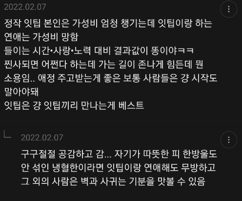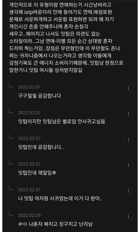 엔팁이고 다른 유형 만날 땐 이렇게까지 멘탈 부서지지 않앗는데 잇팁남은 그냥 상종도 하기 싫어 -