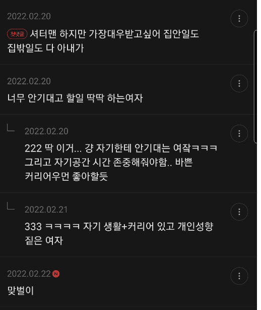 자기 시간 공간 존중해주고 자기한테 안기대는 여자( 챙겨주길 바라는 여자 싫어함)