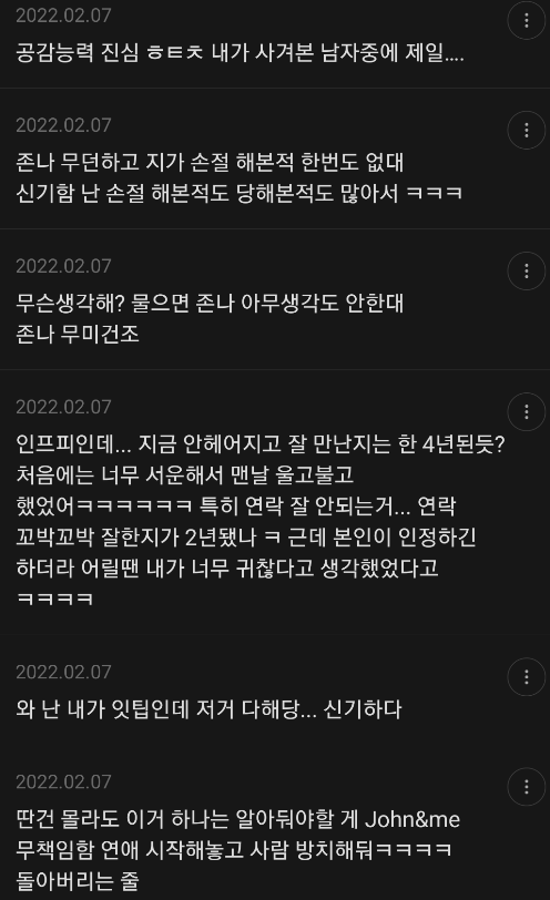 그리고 입 열면 다 구라였음 진심 걔가 나한테 한 말 중에 진실인 말이 있었긴했는지 혼란스러울 정도야