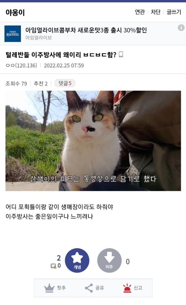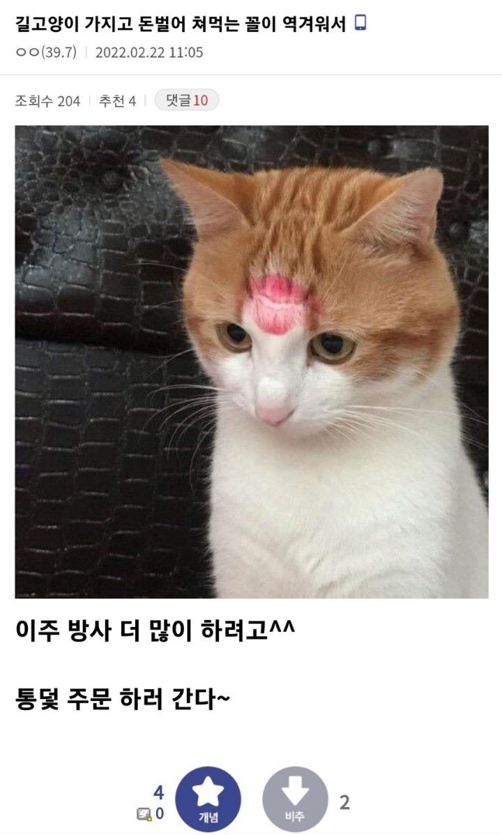 길고양이에게 딱히 피해입은게 없지만 길고양이 가지고 돈버는 꼴이 역겨워서 이주방사 하겠다는 디시남