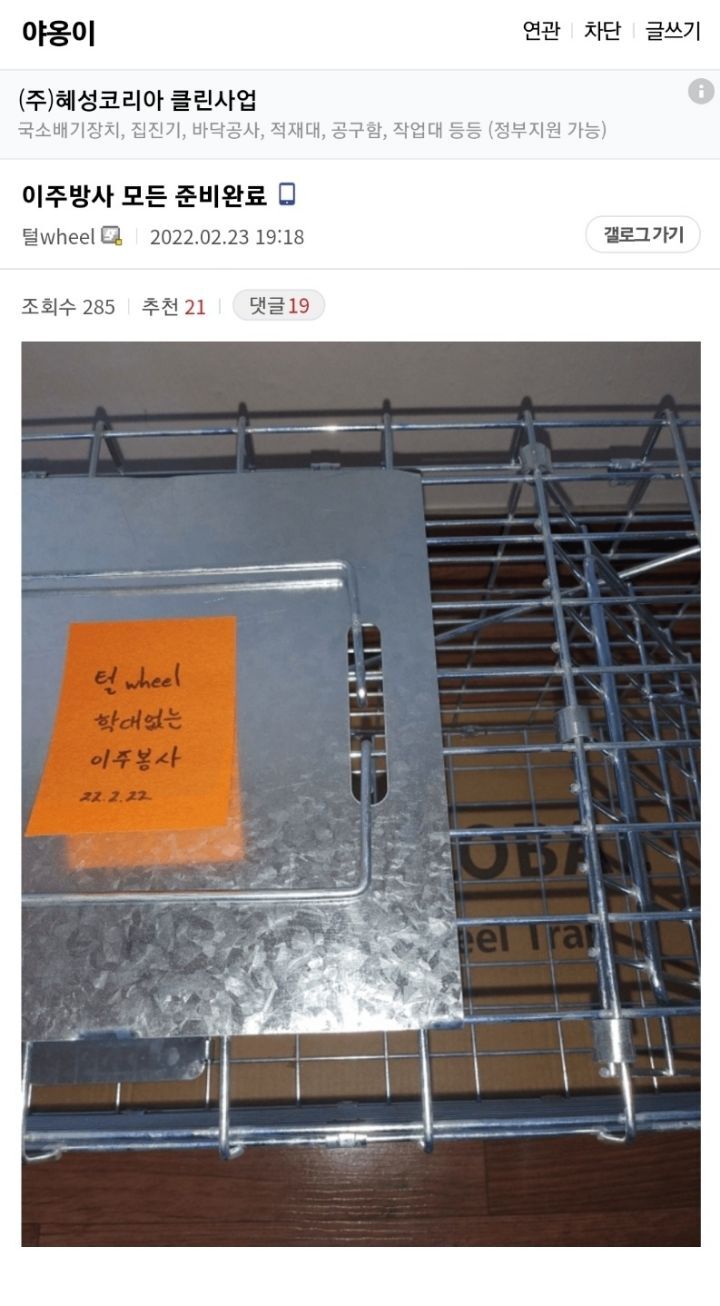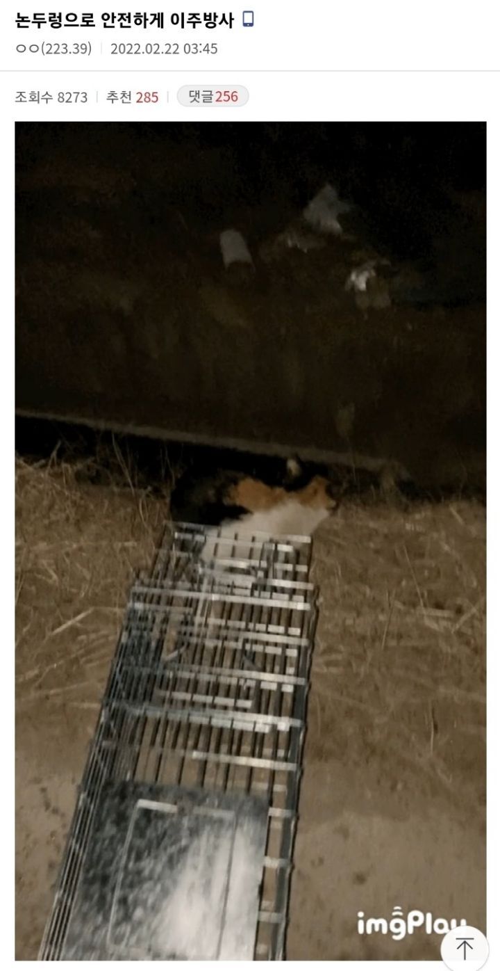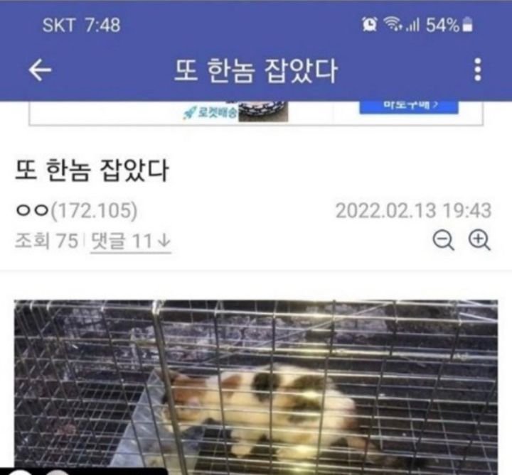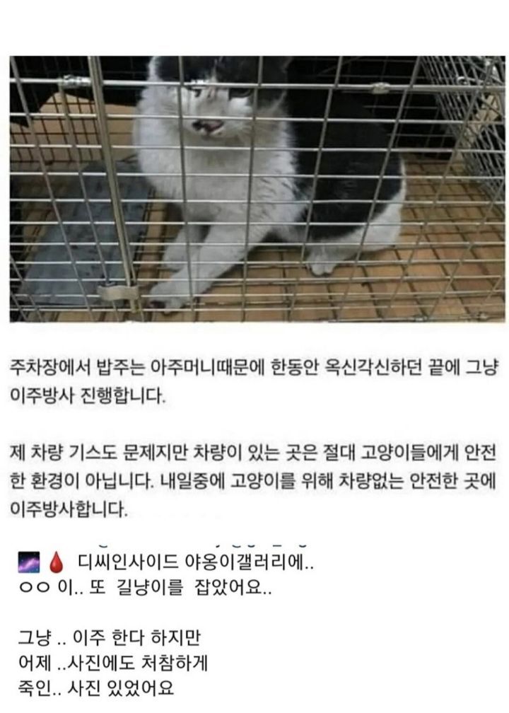 최근 디시인사이드 야옹이갤러리(길고양이 학대 동영상 올라온 곳)에서 길고양이를 잔인하게 죽이는 것 뿐만 아니라 불법 포획틀을 사서 고양이를 포획해서 외진 산이나 아무것도 없는 밭, 고속도로에 버리고 그걸 '이주방사'라고 칭하며 일삼고있어.