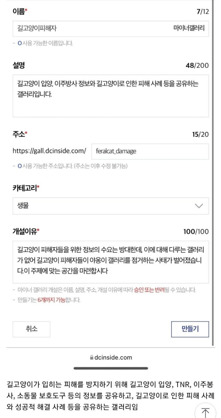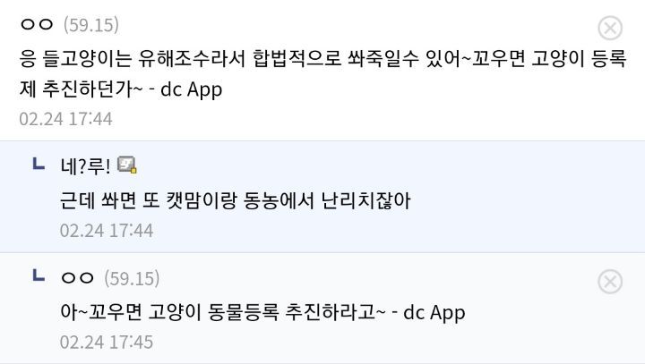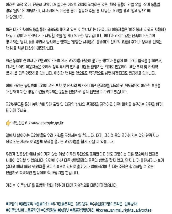 이 입장문 안에도 나와있지만 농림부에서 고양이를 단순히 옮기는 행위는 불법이 아니라고 입장을 밝히면서 무단 포획을 더욱 권장하고 있어. 그 결과 야옹이갤러리는 더욱 기고만장해졌지
