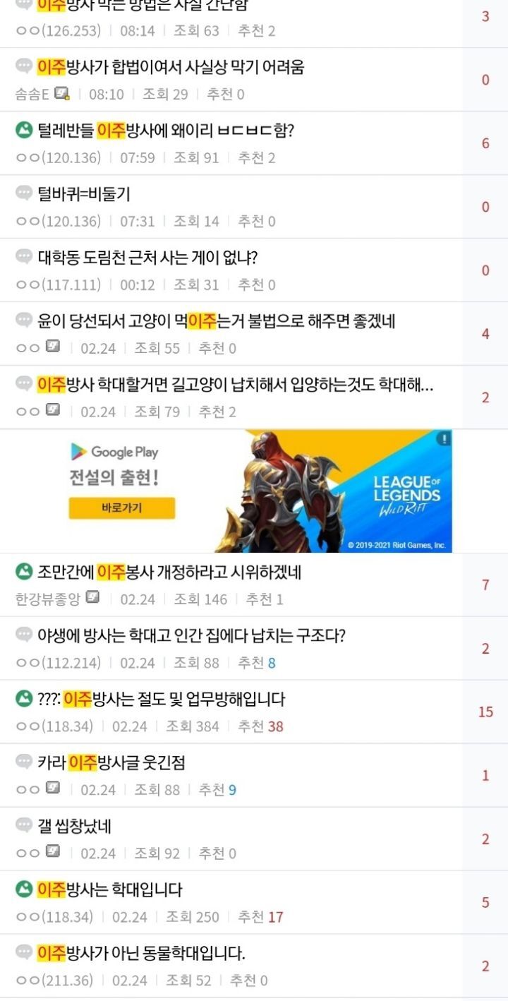 이주방사가 불법이아닌걸 악용해 지네를 길고양이의 피해자라고 칭하며 아예 길고양이 학대갤러리를 새로 만들겠다고 하는 중