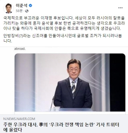 이준석 국민의힘 대표가 러시아의 우크라이나 침공과 관련해 이재명 더불어민주당 대선 후보 발언을 거론하며 “국제적으로 부끄럽다”고 비판했다.