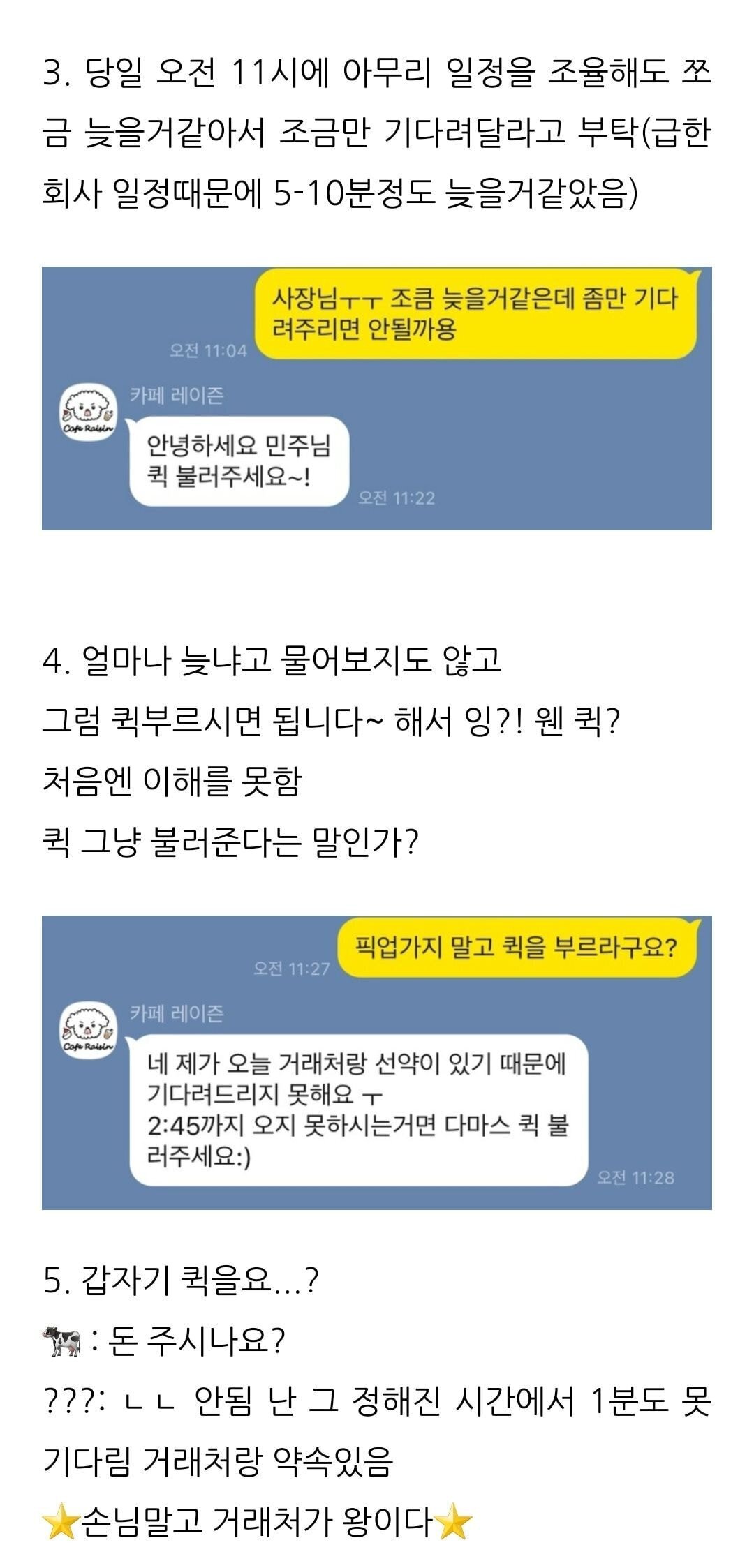 작성자변비비켜 작성시간 22.03.03 음 고객이 잘못한거 아닌가..?? 사장이 주문 전 부터 마지막픽업시간이라고 얘기했던게 몇번인데 진짜 중요한 일이었나보지,,