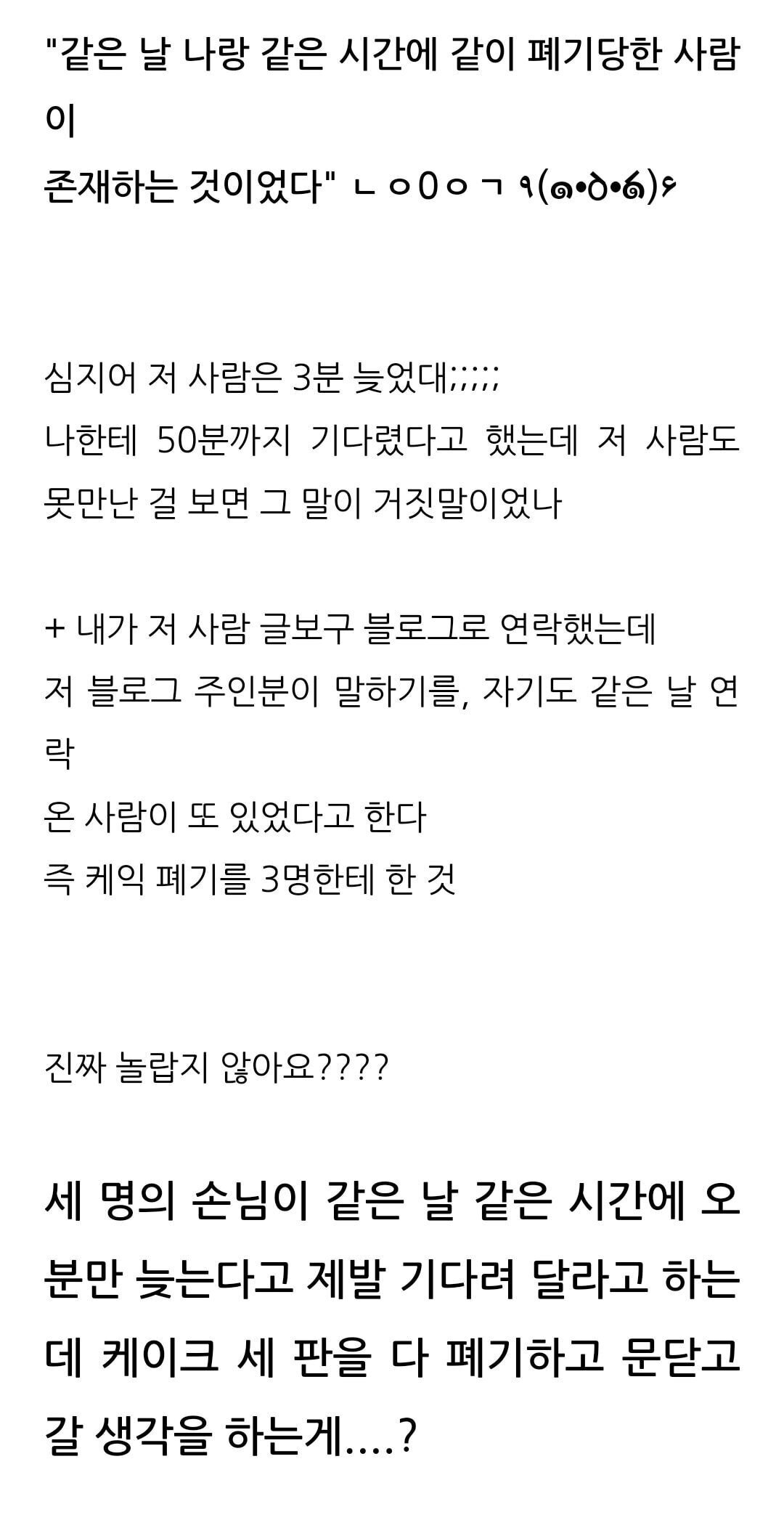 뭐 별일 아니었는데 시간지났다고 폐기했던거면 진짜 매정하긴 한데, 사전에 공지했던거고 사장이 늦은 손님 기다려준 대신에 금전적손해를 크게 볼 수도 있는 상황이 있었을 수도 있잖아,,, 앞뒤 전후 각각의 사정이 있을거라 생각해서 이렇게 다 후려치는것도 옳지않은 것 같아 -