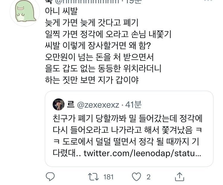친구가 폐기 당할까봐 밀 들어갔는데 정각에 다시 들어오라고 나가라고 해서 쫓겨났음 ㅋㅋ 도로에서 덜덜 떨면서 정각 될 때까지 기다렸대.. https://t.co/LLOntbJ6Fp