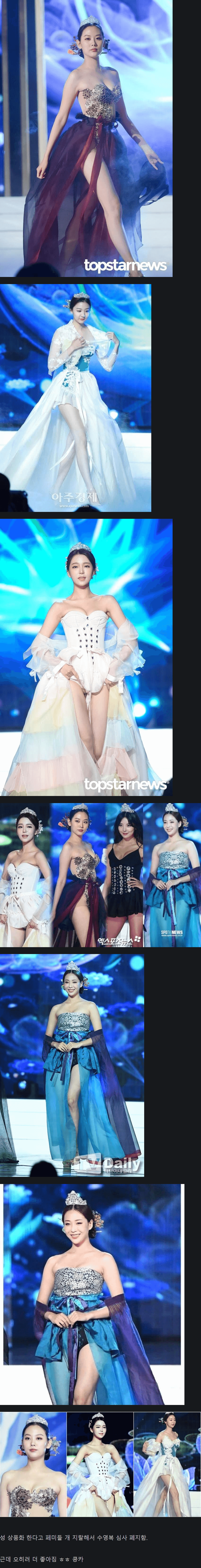 [흥미돋]수영복 심사 폐지된 미스코리아 근황.jpg 작성자오뚜기 구강사업|작성시간22.03.03|조회수16,020 목록 댓글 56 글자크기 작게가 글자크기 크게가 출처 : 여성시대 오뚜기 구강사업 아니 성적대상화 하지말라고 폐지 시킨건데 왜 더 난리가 난거냐;;미스코리아가 아니라 섹시 코스튬 대회인줄애초에 미스코리아 대회를 왜 하는지 이해가 안되지만 이건 아니잖아;;; 다음검색 현재 게시글 추가 기능 열기 북마크 공유하기 신고 센터로 신고 댓글 댓글 56 댓글쓰기 답글쓰기 댓글 리스트 작성자브리트니스핑크스 | 작성시간 22.03.03 이거 일등해서 뭐하게요 작성자세브란스 병원에 왜요 | 작성시간 22.03.03 니들머함 작성자꽃같은 세상 | 작성시간 22.03.03 뭐하자는건지 작성자눈이녹으면봄이와요 | 작성시간 22.03.03 나는 왜 저게 난리를 쳐도 폐지 안되는지 진짜 진짜 노이해다 심지어 수영복 사라지고 한복으로 저러는데 …? 환장스러운 작성자이 휘 | 작성시간 22.03.03 한복 좀 똑바로 입어라... 씌 댓글 전체보기