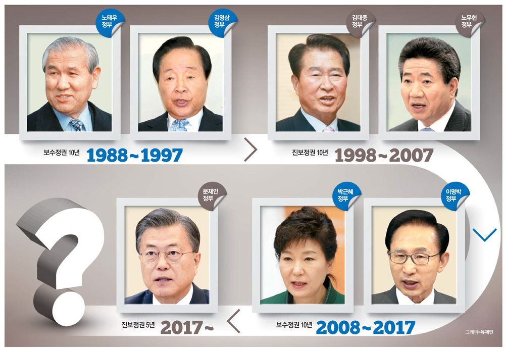 민주정의당(노태우)-민주자유당(김영삼)-새정치국민회의(김대중)-새천년민주당(노무현)-한나라당(이명박)-새누리당(박근혜)-더불어민주당(문재인)