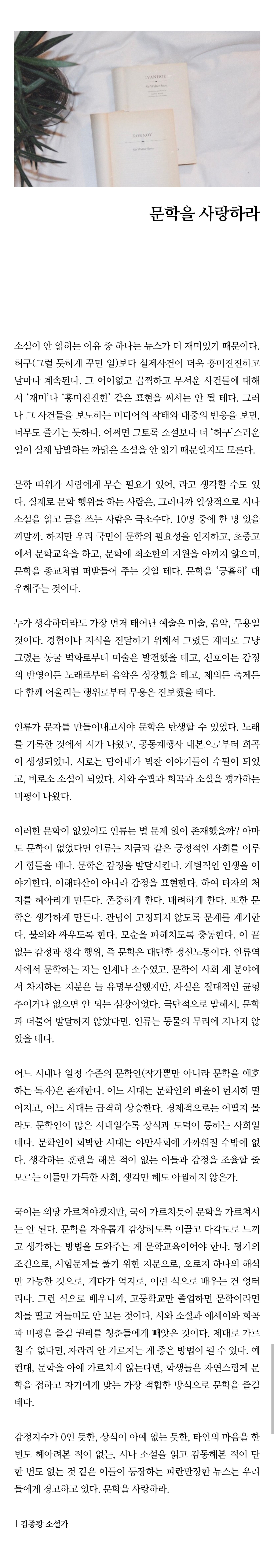 작성자느개비알페스중독자 작성시간 22.03.06 문학 정말 사랑해… 책을 읽으면 평소에 생각지도 못했던 관점이나 입장 등등 여러가지를 배울 수 있어서 좋아 놀라움의 연속이야 ㅎㅎ