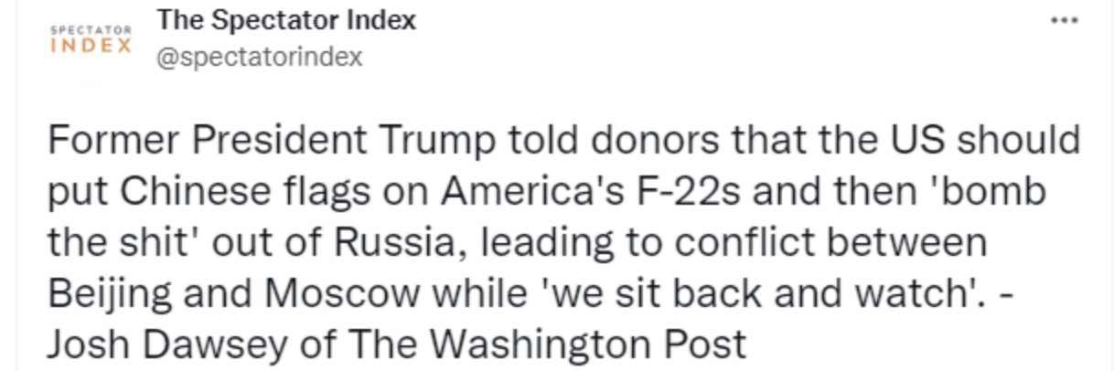 [스크랩] [기타]트럼프: F22에 중국국기 달고 폭격하자 작성자맵슐랭존맛|작성시간22.03.06|조회수1,189 목록 댓글 2 글자크기 작게가 글자크기 크게가 f22에 중국국기 달고 러시아군 박살내고...그다음 러시아중국 개싸움 팝콘각 즐기자 ㅊㅊ개드립 다음검색 스크랩 원문 : 도탁스 (DOTAX) 현재 게시글 추가 기능 열기 북마크 공유하기 신고 센터로 신고 댓글 댓글 2 댓글쓰기 답글쓰기 댓글 리스트 작성자R=VD 2021 은행 퇴사한다 | 작성시간 22.03.06 독재자들끼리의 싸움인가 작성자super jr | 작성시간 22.03.06 그래 차라리 댓글 전체보기