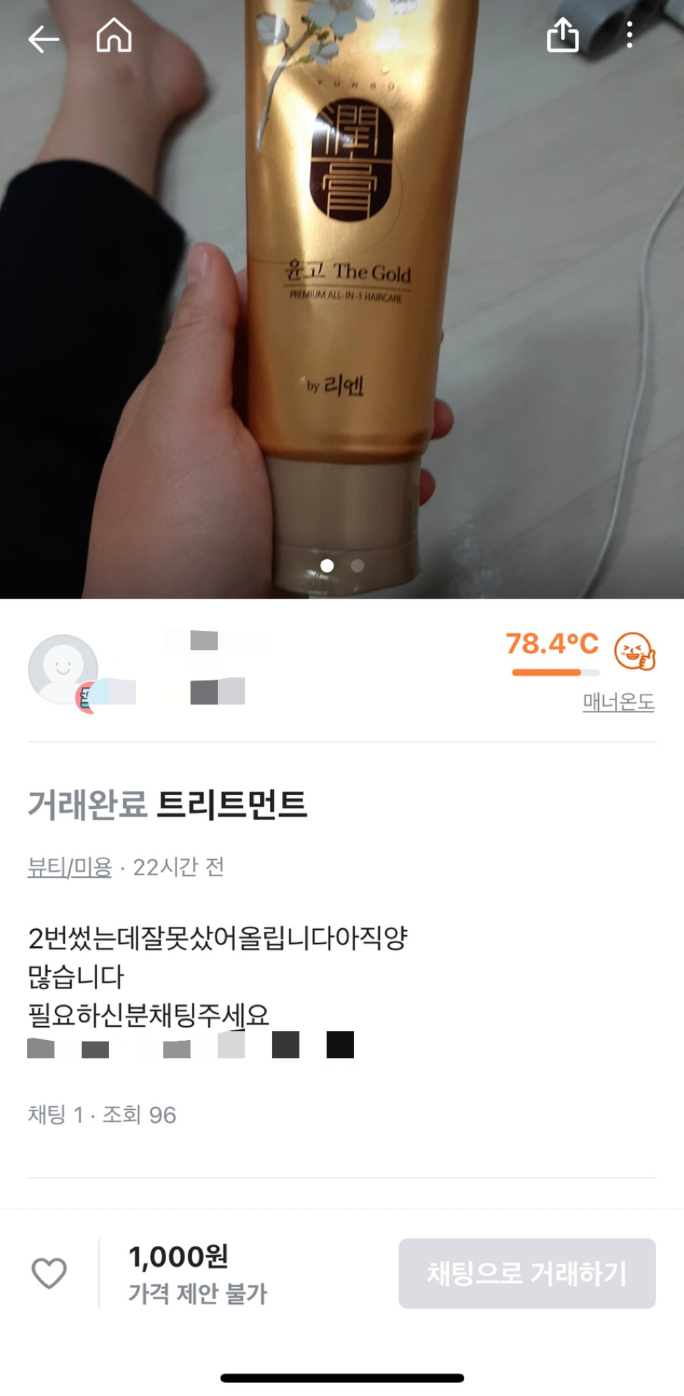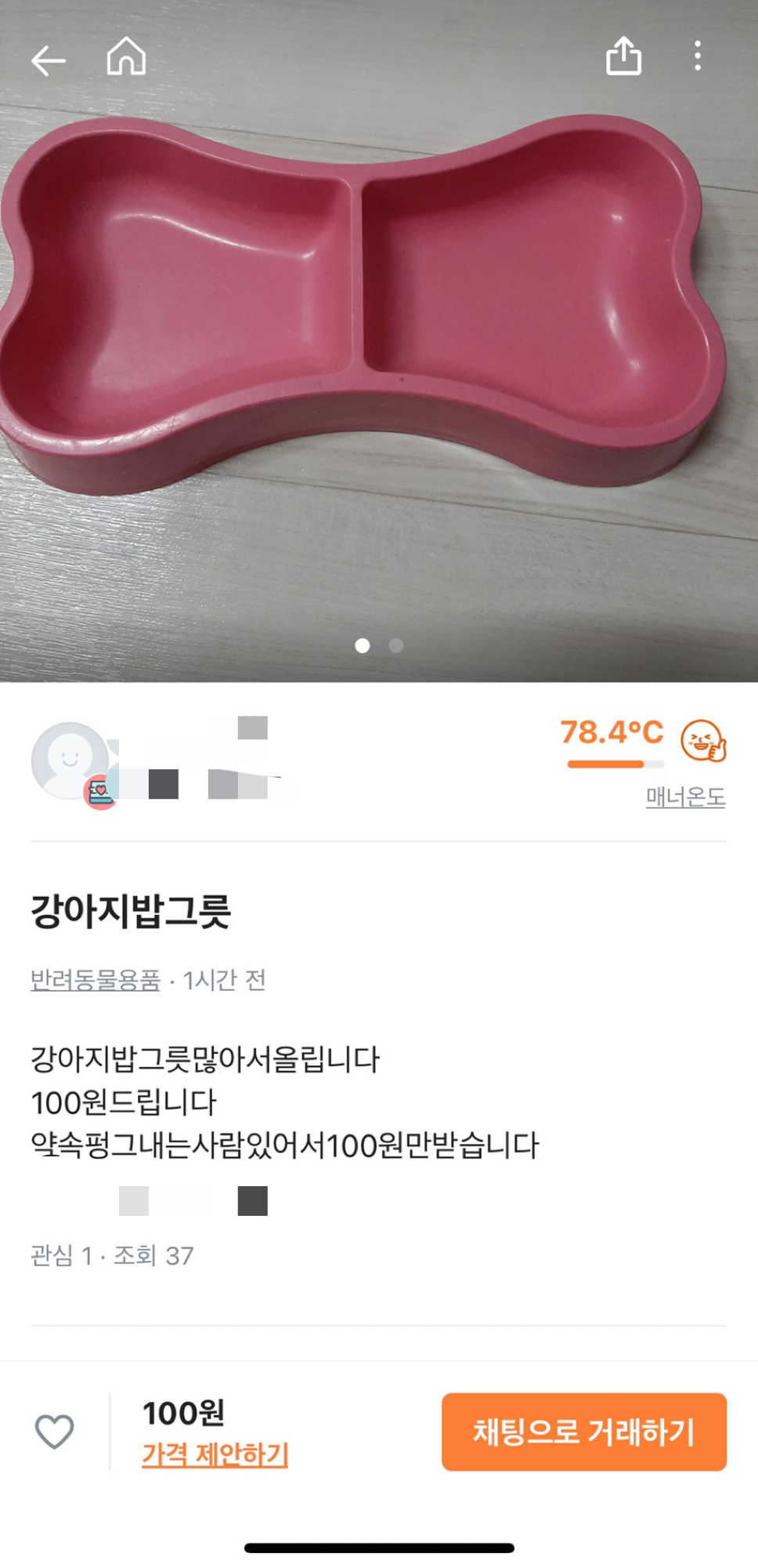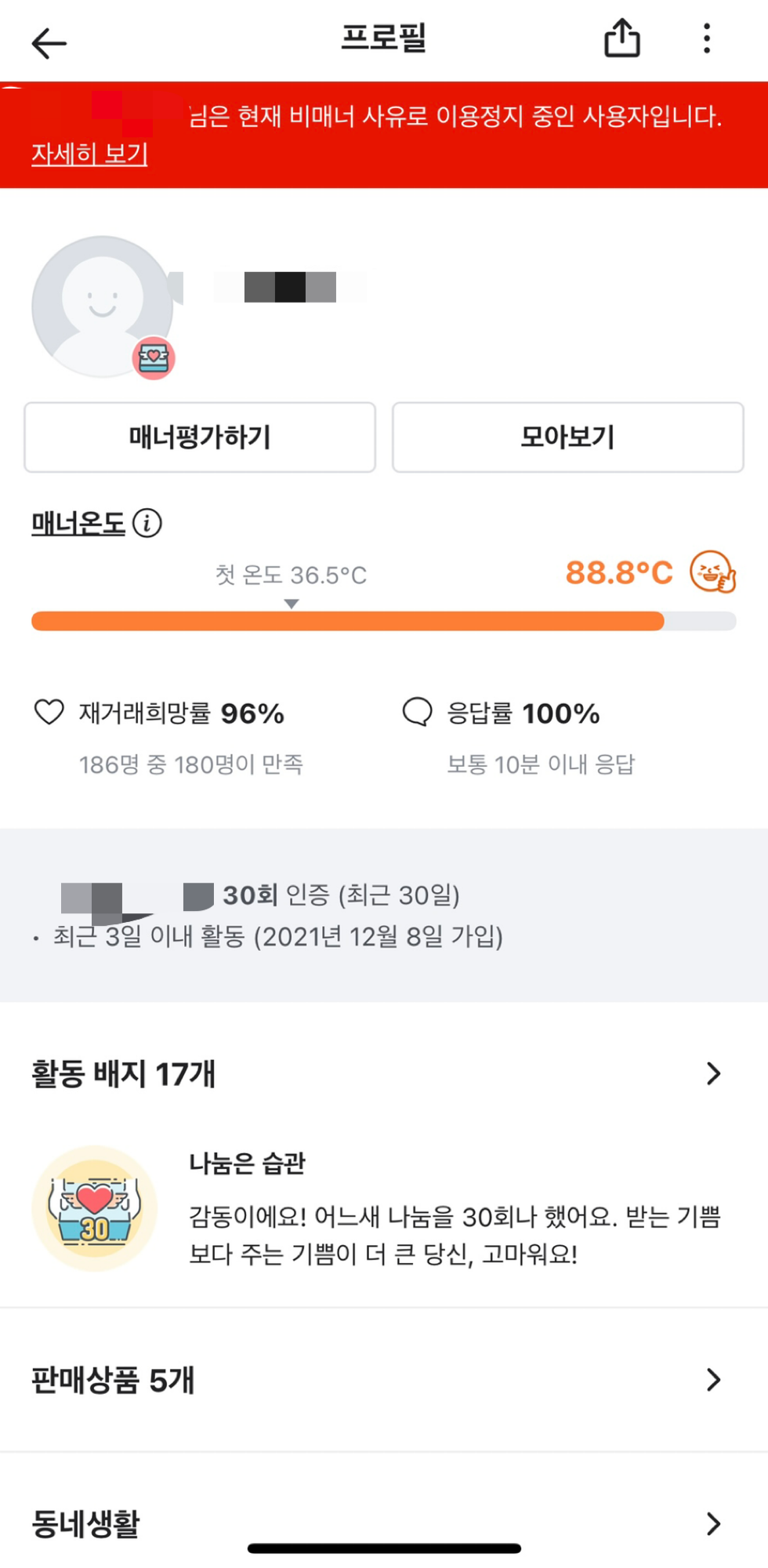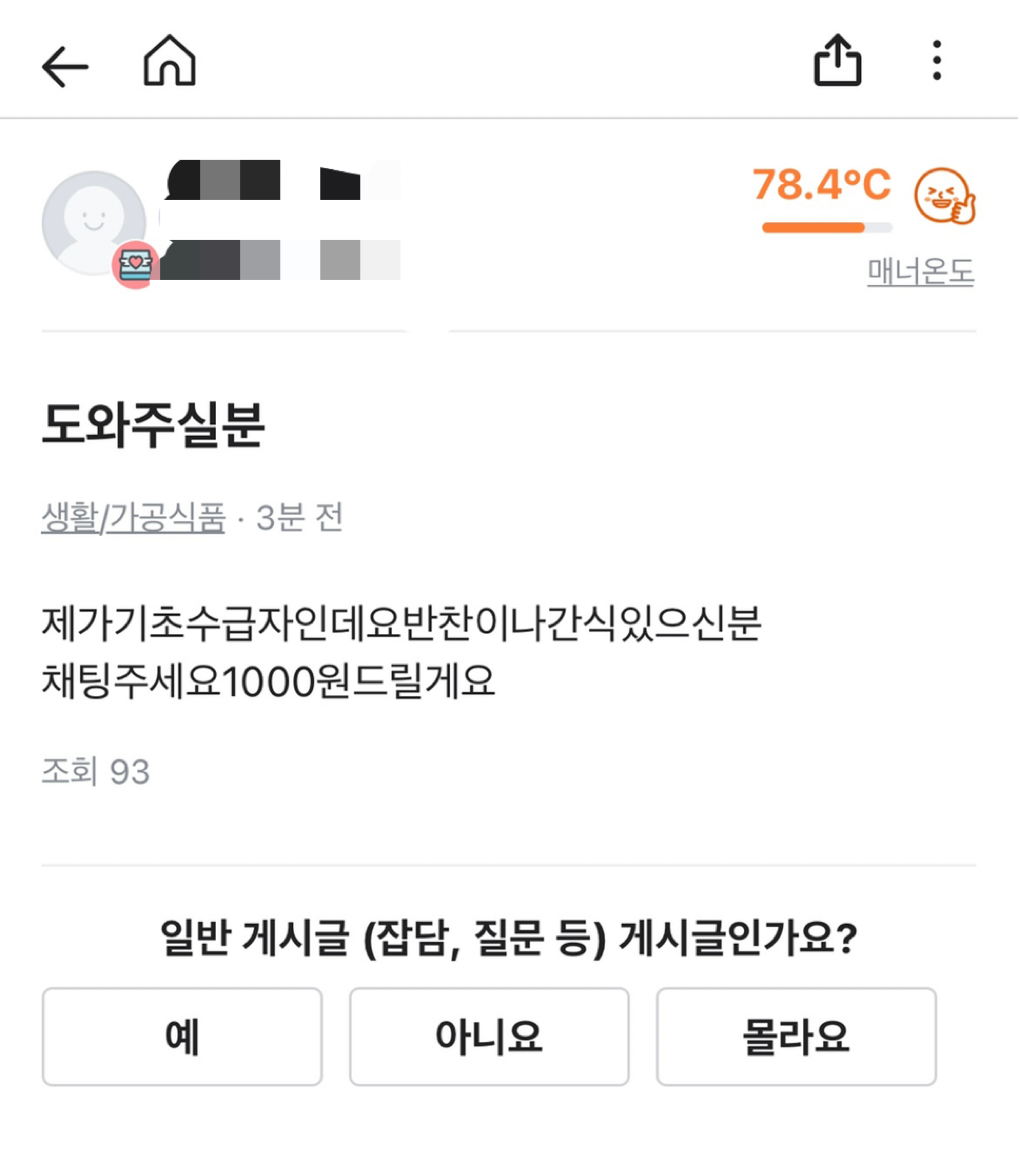 우연히 당근마켓 들어갔다가 도와주실분 이라는 글이 있어서 보다가 아이디를 타고 들어가보니 온도가 높아서 내역을 보니 나눔도 많이 하셨더라구요.. 반찬이나 간식을 1000원과 교환하려고 하셨던거 같은데 잠깐 사이 사람들이 신고했는지 정지당하신거 보니 괜시리 마음이 먹먹해지네요. 혹시 몰라 지역과 아이디는 가렸습니다.