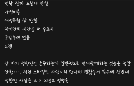 공감능력없고 밀당없고 존나솔직해 그냥 .. 그대로.. 고집도 ㅈㄴ쎄긴함 ; 근데 애정표현 ㅈㄴ안라는데 내가 졸라리 하는편니라< 그래도 같이 해주긴햇엇음 약간 영혼리스 말투로 ㅎㅎ ;; -