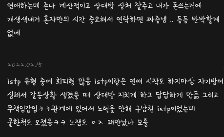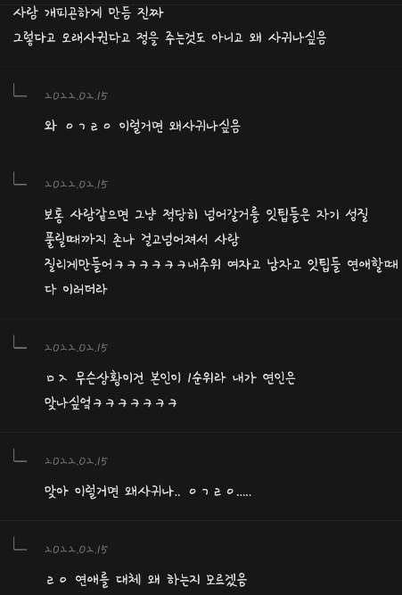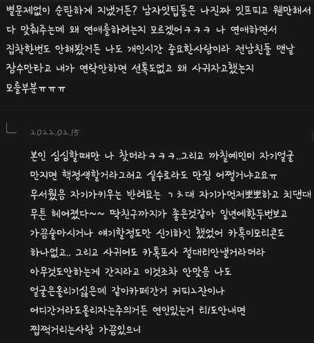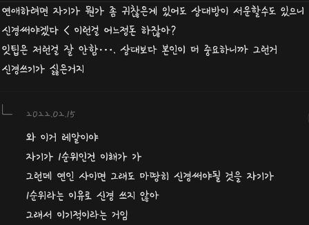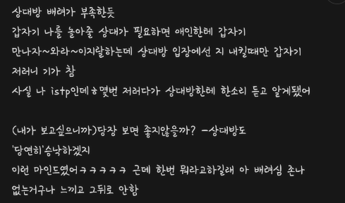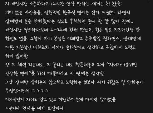 -저런 사람들은 연애 왜 하는거야? 걍 옆에 누굴 두고싶은건가? 상대가 귀찮은데 왜 만나는거지. 헤어지자 말하긴 겁나고 귀찮은걸까