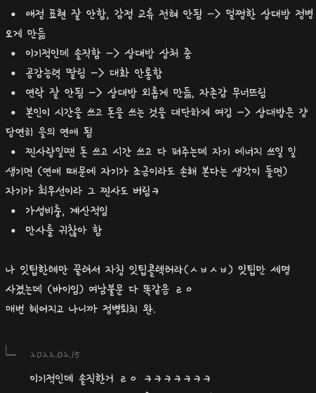 3. 상대방에 대한 기본적인 배려조차 자기가 손해본다고 생각 본인 맘대로 행동하고 그게 자기가 1순위인 연애를 한다 생각한다 함