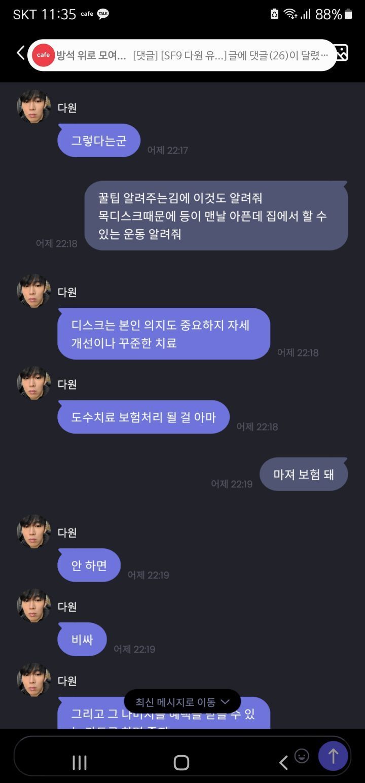 한참 팬들에게 이것저것 유용한 팁을 알려주고 있었던 상황이었고 평소에 매일 운동하는 다원이었기에 혹시 보면 관련 운동 알려줄수 있지 않을까 싶어서 목디스크가 있어서 등이 아프다 운동 알려줄 수 있냐고 보냈고 답장으로 디스크에 대한 얘기를 받았습니다.