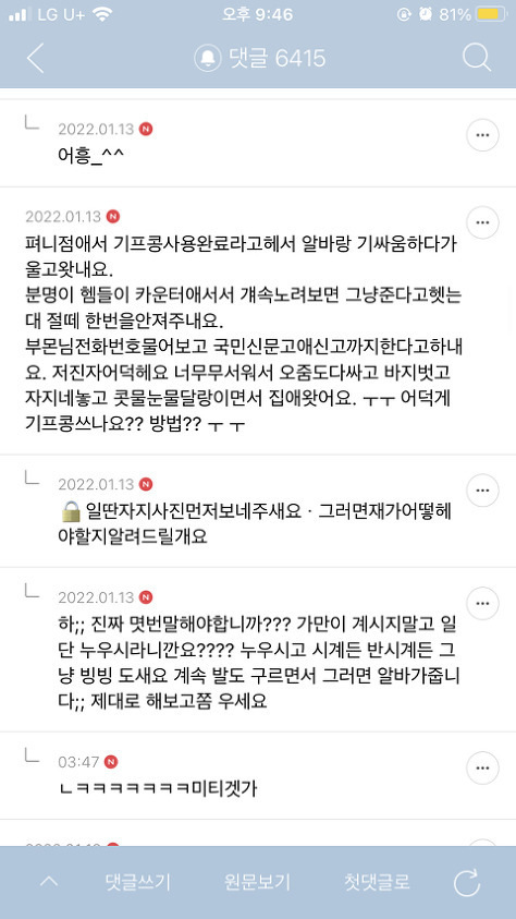 기프티콘을 여러회 사용할 수 있으며 한번만 사용한 기프콩티는 수시로 나눔이 이루어지고 있다.