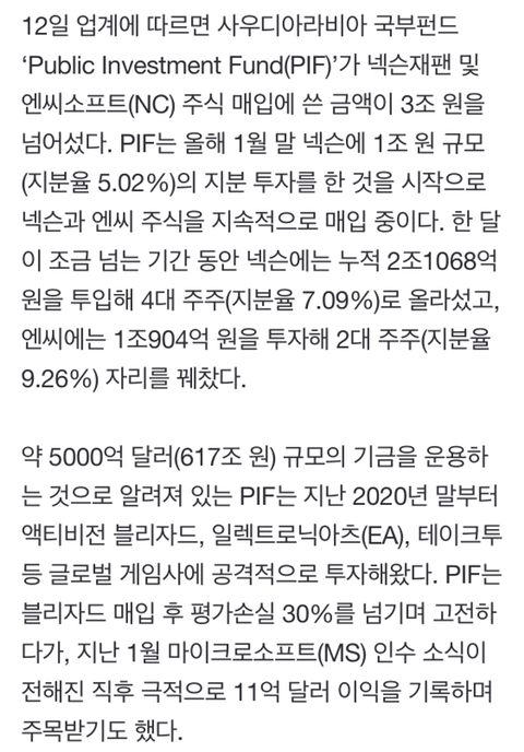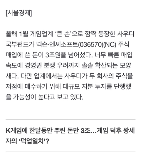 [여시뉴스데스크]K 게임에 푹 빠진 사우디 왕세자…넥슨·엔씨에 3조 '돈 폭탄' 작성자이제니|작성시간22.03.14|조회수5,532 목록 댓글 35 글자크기 작게가 글자크기 크게가 출처 : https://n.news.naver.com/article/011/0004028817?cds=news_editK 게임에 푹 빠진 사우디 왕세자…넥슨·엔씨에 3조 '돈 폭탄'[서울경제] 올해 1월 게임업계 ‘큰 손’으로 깜짝 등장한 사우디 국부펀드가 넥슨· 엔씨소프트(036570) (NC) 주식 매입에 쓴 돈이 3조원을 넘어섰다. 너무 빠른 매입 속도에 경영권 분쟁 우려까지 n.news.naver.com전문출처 다음검색 현재 게시글 추가 기능 열기 북마크 공유하기 신고 센터로 신고 댓글 댓글 35 댓글쓰기 답글쓰기 댓글 리스트 작성자금쪽아금쪽이는웅앵 | 작성시간 22.03.14 현질한줄 알았잖아요.. 작성자룩앳마이아이즈 | 작성시간 22.03.14 넷마블좀사줘 ㅜㅜ시발 ㅜㅜ 작성자뮤닝뮤닝 | 작성시간 22.03.14 마!! 넷마블 저점인데 왜넷마블은 안샀노!!!! ㅠㅠ 1조만 사주라노!!! 작성자짱 퀴벌레 | 작성시간 22.03.14 나 메소 1000억만 줄 수 있어? 작성자올림픽가즈아 | 작성시간 22.03.14 문상 만원만. 댓글 전체보기