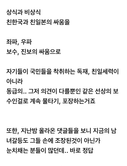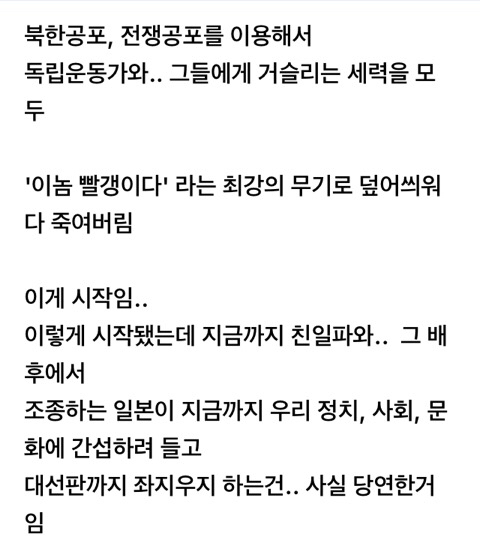 민초 정신은 한국인의 피에 흐르고 대대로 유전자에 인이 박혀서 아무리 니들이 선동하고 날조하고 갈라치고 나라를 무너뜨리려 발악을 해도 위기를 DNA로 감지했는지 어쩔수없는 특유의 한국인의 집단지성 발휘해서