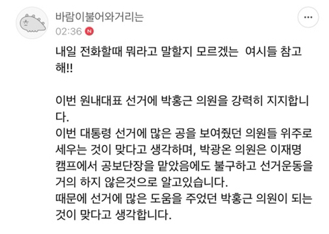 본문에 대본 참고했고 만약 박광온 에게 표가 가게 되면 차기 총선에서 공천 반대랑 낙선 운동도 할 의향 있다고 얘기했어 !