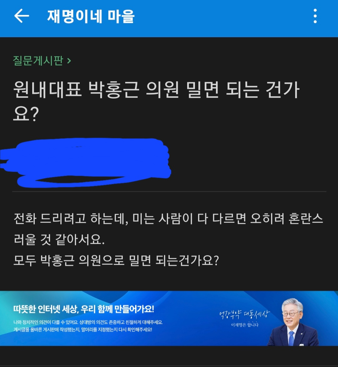 다음 원내대표가 재명여시를 지켜줄 수 없는 사람이면 진짜 큰일이야! 나 진짜 미치고 팔짝 뛰겠음