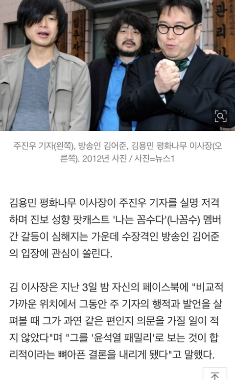작성자데일 쿠퍼 작성시간 22.03.19 주진우는 기자라 그런지 여기저기 쏘스 얻을라고 다 친하게 잘지내고 약간 여우 같은 그런 느낌이지 않아?ㅋㅋ 주진우 이재명 비호감 절정일때도 이재명이랑 친하고 밀어준다고 욕먹고 그랬는데 ㅋㅋ 그리고 윤 검찰총장 밀어줄때 지금처럼 통수 칠줄 누가알았겠어 ㅠㅠㅠㅠㅠ