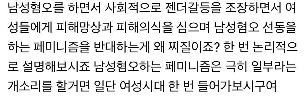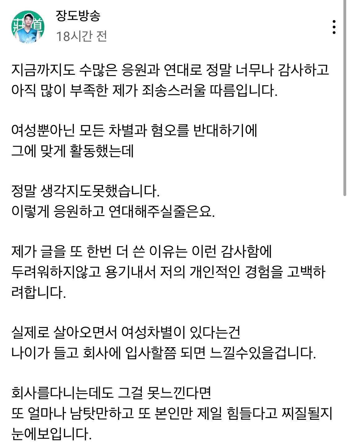 여성도 아니고 남성인 유튜버가 적극적으로 페미니즘을 옹호하고 있고, 그에 대한 비난도 혼자서 감내하고 있어. 나는 유튜브 본인도 아닌데 댓글 캡쳐하면서 충격받아서 심장이 너무 뛰고 진정이 안돼 ㅠㅠ…여자들이 같이 연대해주길 바라는 마음으로 글을 작성해