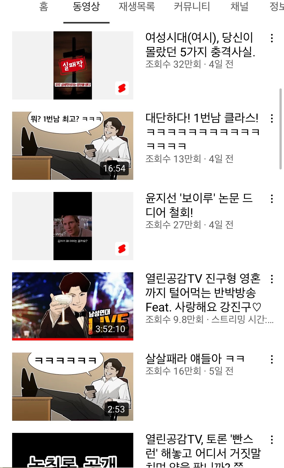 아래는 신남연 채널의 영상 목록이야. 여시들 굳이 검색해서 들어갈 필요는 없을 것 같아서 내가 캡쳐해왔어