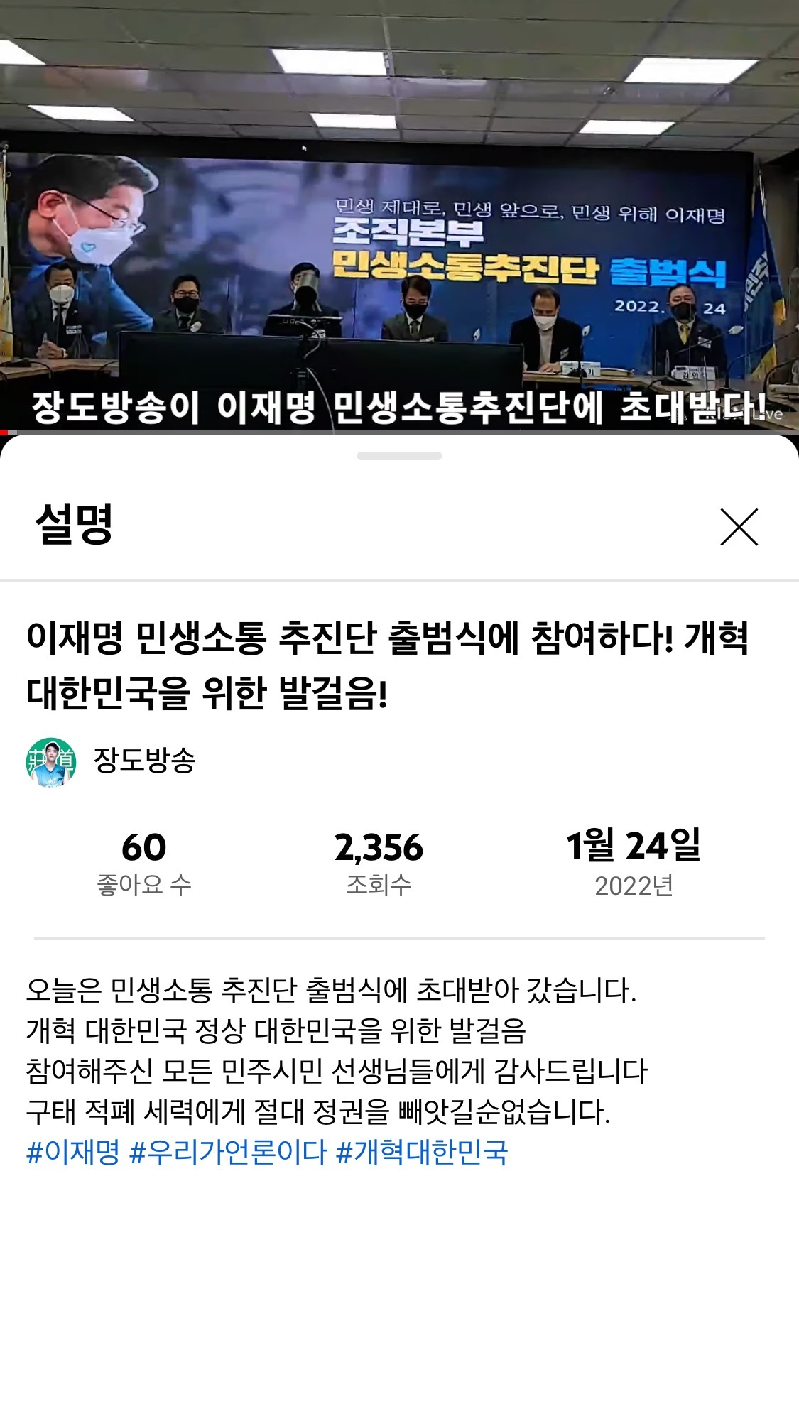 이 1번남은 장도방송이라는 진보진영 유튜버야. 남성이지만 페미니즘을 적극적으로 주장하고 찬성해. 이재명 민생소통추진단출범식에도 초대받아서 다녀왔어