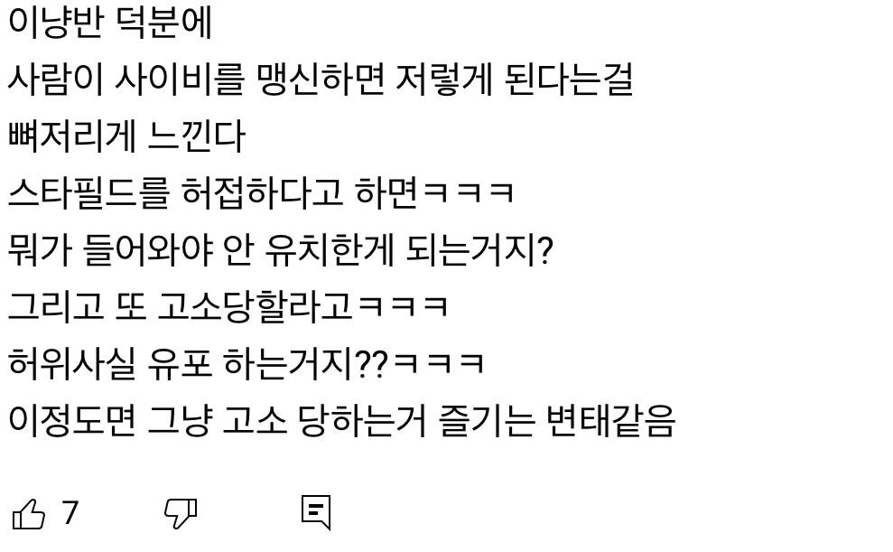 작성자제육우동 작성시간 22.03.19 나 저기 선플 달았는데 아직도 대댓 달리는중ㅎㅎ 덕분에 나도 2번남들한테 기분안좋을때마다 악플 쓰고 다님