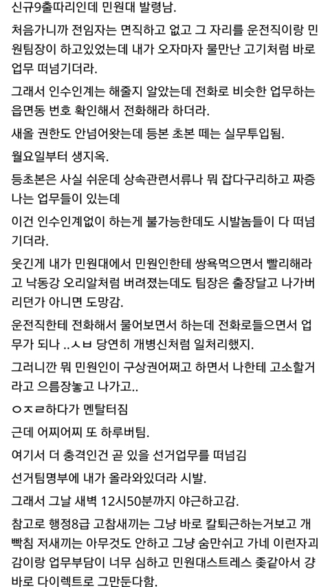작성자김스멜스멜 작성시간 22.03.26 헐... 그냥 요즘은 개나소나 공무원해서 저런 쓰렉같는 인성의 선임들이 고여버리는구나