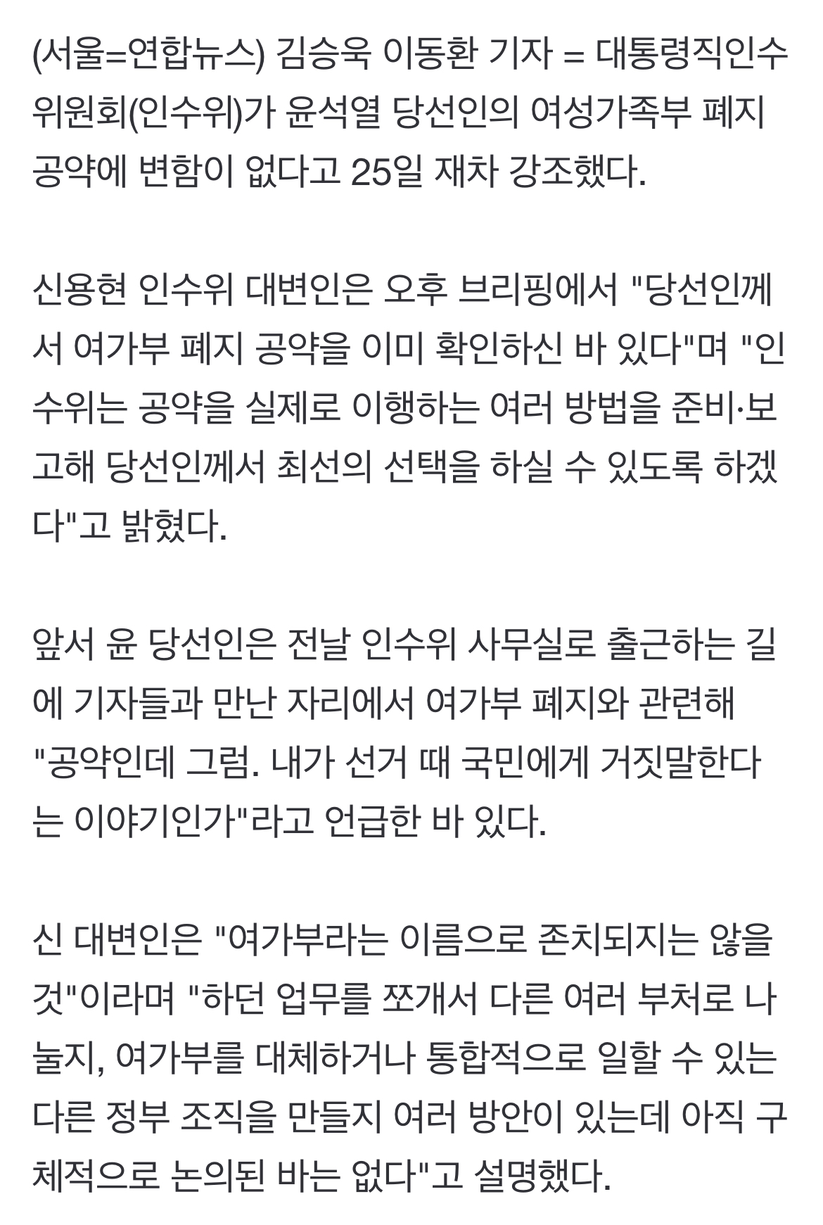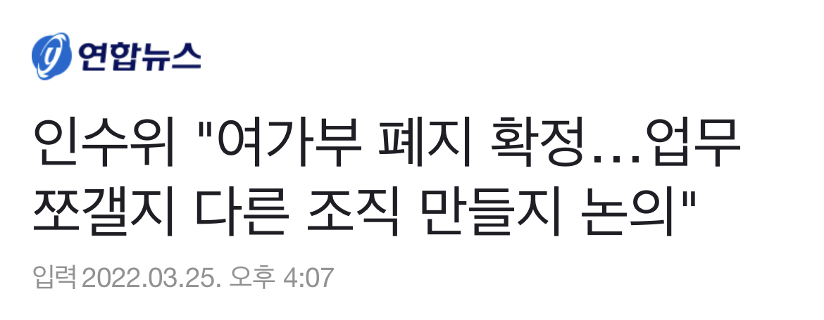 (서울=연합뉴스) 김승욱 이동환 기자 = 대통령직인수위원회(인수위)가 윤석열 당선인의 여성가족부 폐지 공약에 변함이 없다고 25일 재차 강조했다.