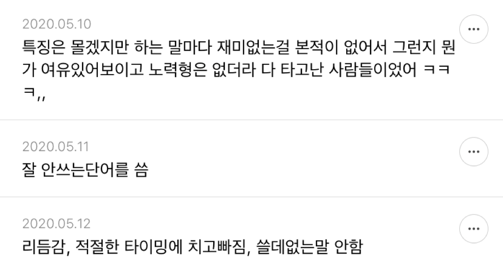 작성자하이지 작성시간 22.04.02 깡다구있고 여유있음,,, 눈치가 존나빠른데 그 눈치로 공기흐름읽고있는게 티가 1도안남