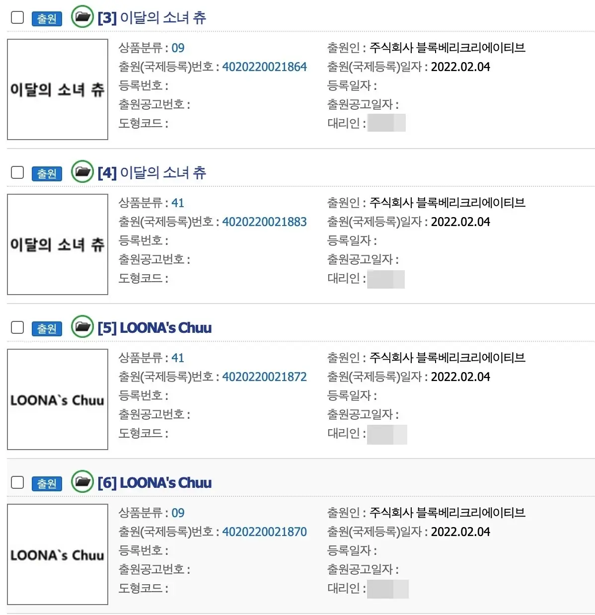 ‘이달의 소녀’ 소속사 블록베리크리에이티브는 지난달 4일 특허청에 ‘이달의 소녀 츄’, ‘LOONA’s Chuu’ 등의 상표권을 등록했다.