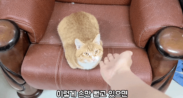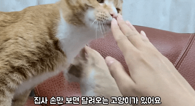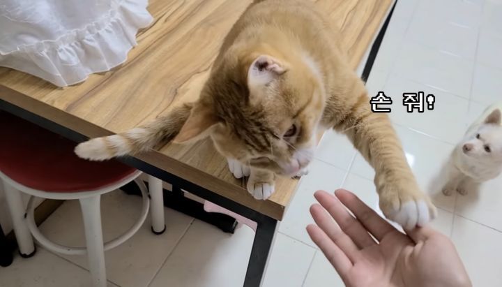 흰 고양이도 손내밀며 이리와 하니 냉큼 다가와서 애교부림