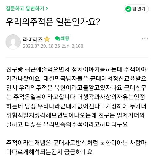 [토론싸워야제맛]대한민국 주적은 북한이다vs일본이다 작성자요즘펩시맛있더라|작성시간22.04.15|조회수4,632 목록 댓글 90 글자크기 작게가 글자크기 크게가 출처 : 여성시대 요즘펩시맛있더라 우리나라 현재 휴전국이기때문에 주적은 북한이다.천안함 사건, 평소 미사일 쏘는것도 우리 경계하려고 그런거 아니냐;vs아니다 뭔소리냐 왜란, 일제때부터 지금까지 이어오는 일본이 주적이다. 친일파가 우리나라 곳곳에 뿌리잡고 뒤흔드는데 무조건 일본이다.여시들의 생각은? 다음검색 현재 게시글 추가 기능 열기 북마크 공유하기 신고 센터로 신고 댓글 댓글 90 댓글쓰기 답글쓰기 댓글 리스트 작성자my rule | 작성시간 22.04.15 당연히 일본이지 시발 작성자wdihtl | 작성시간 22.04.15 닥일(본) 작성자친칠라의개딸325684호 | 작성시간 22.04.15 일본이랑 중국임 북한은 이제 협력관계로 가자!!!! 작성자금딸검 | 작성시간 22.04.15 일본 중국 작성자궁금한게일짱캡많은여시 | 작성시간 22.04.15 머야 존나 일본임 댓글 전체보기