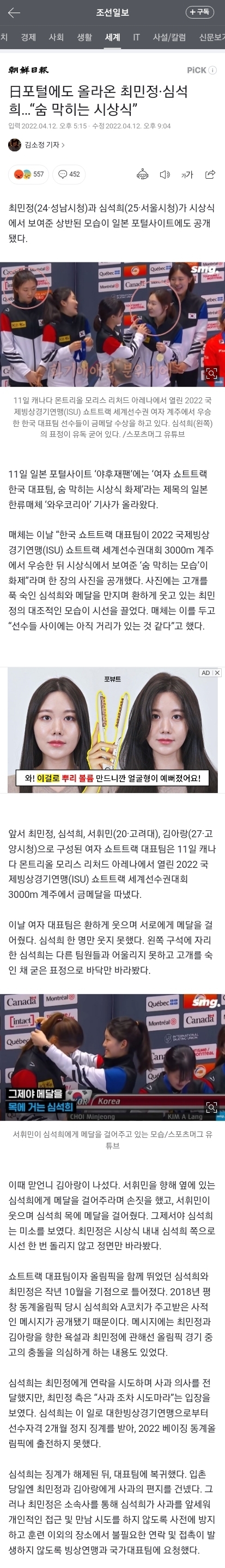 [여시뉴스데스크]日포털에도 올라온 최민정·심석희…“숨 막히는 시상식” 작성자밥은 지금도...|작성시간22.04.15|조회수19,502 목록 댓글 10 글자크기 작게가 글자크기 크게가 출처 : https://n.news.naver.com/article/023/0003684759日포털에도 올라온 최민정·심석희…“숨 막히는 시상식”최민정(24·성남시청)과 심석희(25·서울시청)가 시상식에서 보여준 상반된 모습이 일본 포털사이트에도 공개됐다. 11일 일본 포털사이트 ‘야후재팬’에는 ‘여자 쇼트트랙 한국 대표팀, 숨 막히n.news.naver.com 다음검색 현재 게시글 추가 기능 열기 북마크 공유하기 신고 센터로 신고 댓글 댓글 10 댓글쓰기 답글쓰기 댓글 리스트 작성자애스파는나야 | 작성시간 22.04.15 관심이 존나게 많으시네 작성자JENNIERUBYJANE | 작성시간 22.04.15 느그 나라 일이나 신경 써~ 작성자쟈갇씌앙 | 작성시간 22.04.15 관심 ㅈㄴ많다 ㅋㅋ 작성자대가리깨져도퍼랭이 | 작성시간 22.04.15 좆본 시발 우리한테 관심 꺼줘. 작성자얼리버드 이즈 타이얼드 | 작성시간 22.04.15 우리한테 관심이 왤케 많아 댓글 전체보기