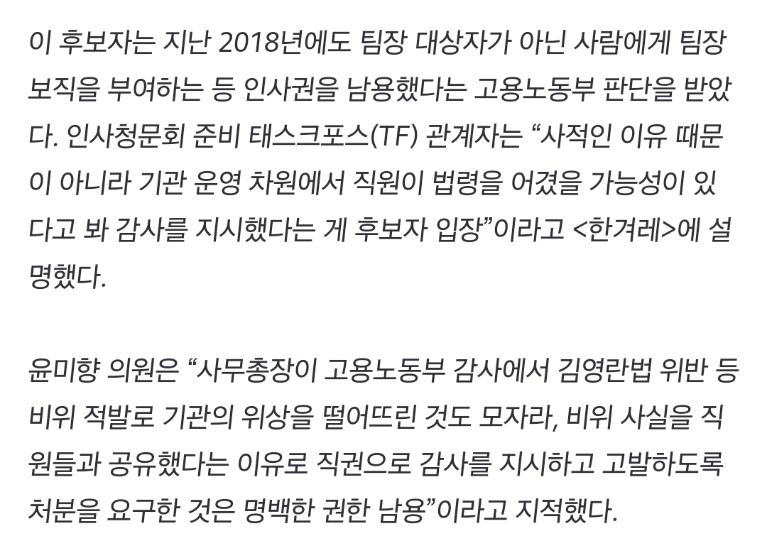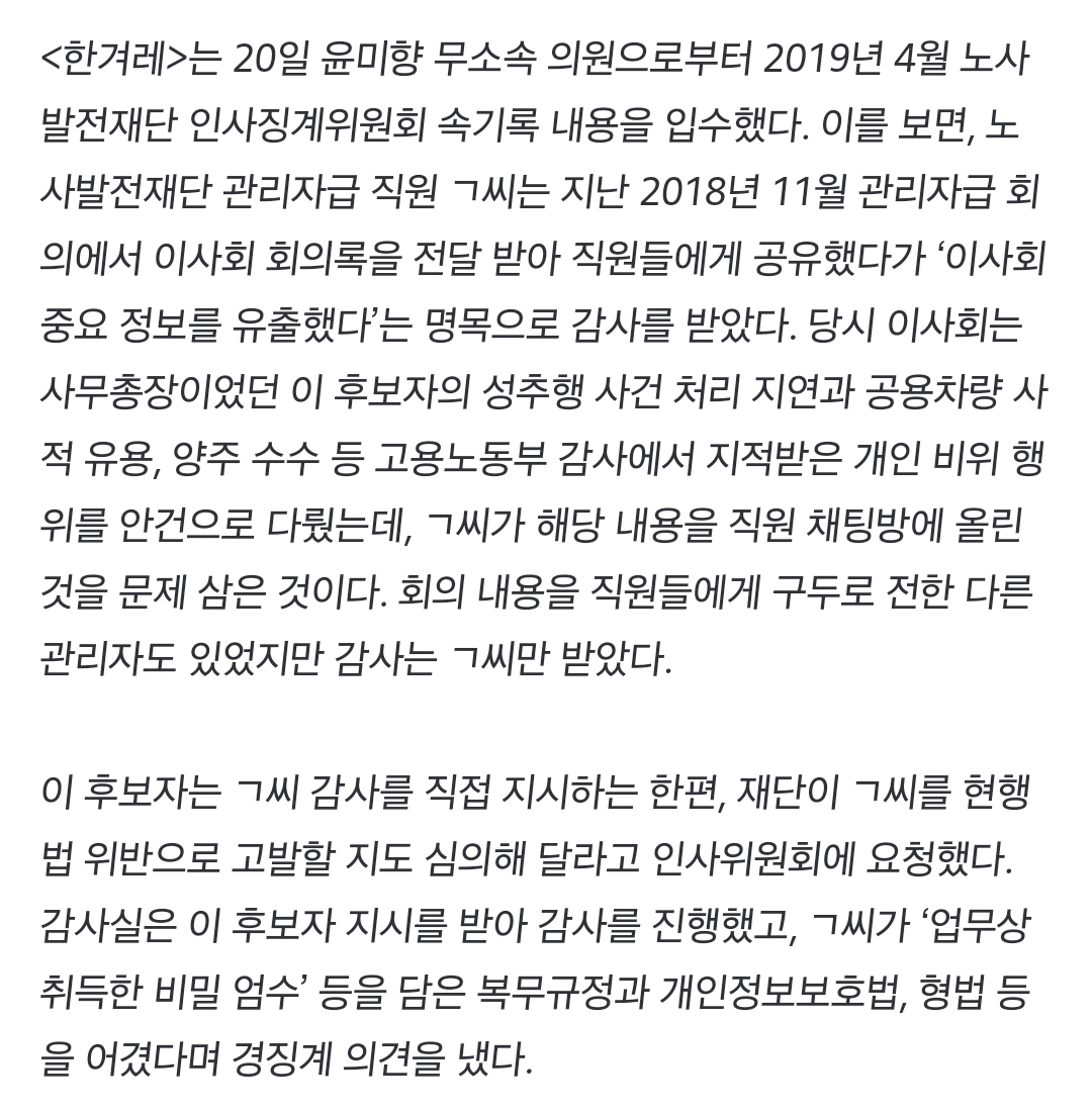[여시뉴스데스크][단독] 이정식 후보자, 본인 비위 공유한 직원 ‘표적 감사’ 지시 작성자쨈시|작성시간22.04.20|조회수608 목록 댓글 1 글자크기 작게가 글자크기 크게가 출처 : https://n.news.naver.com/article/028/0002587532[단독] 이정식 후보자, 본인 비위 공유한 직원 ‘표적 감사’ 지시이정식 고용노동부 장관 후보자가 노사발전재단 사무총장 시절 자신의 비위 행위 내용이 포함된 이사회 내용을 사내 직원들에게 전달한 관리자를 콕 집어 ‘표적 감사’를 지시한 것으로 확인n.news.naver.com..전문 출처뭐 이런 사람이 고용노동부 장관을 맡음m..? 다음검색 현재 게시글 추가 기능 열기 북마크 공유하기 신고 센터로 신고 댓글 댓글 1 댓글쓰기 답글쓰기 댓글 리스트 작성자가불선진국 | 작성시간 22.04.20 윤썩창이새끼는 하나같이 저처럼 개썩은 것들만 데리고 왔네 댓글 전체보기