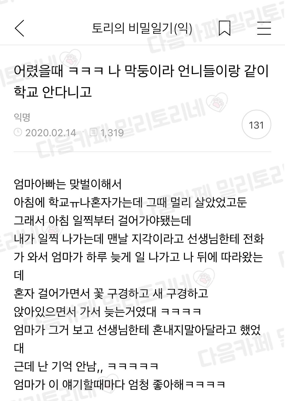 [스크랩] [흥미돋]어렸을 때 나 막둥이라 언니들이랑 같이 학교 안 다니고 작성자쩡이언니|작성시간22.04.20|조회수10,130 목록 댓글 38 글자크기 작게가 글자크기 크게가 출처 : 여성시대 은해원출처 https://twitter.com/milytoryfan/status/1432943852143276034?s=19 다음검색 스크랩 원문 : *여성시대* 차분한 20대들의 알흠다운 공간 현재 게시글 추가 기능 열기 북마크 공유하기 신고 센터로 신고 댓글 댓글 38 댓글쓰기 답글쓰기 댓글 리스트 작성자금지옥엽친칠라 | 작성시간 22.04.20 진짜 너무귀엽다 정말 너무 귀여워 ㅜㅜ 작성자부릉부릉부르르으응 | 작성시간 22.04.20 내딸램이야.. 작성자소담촌 | 작성시간 22.04.20 아우 귀여워 ㅠㅠㅠㅠㅠㅠ 작성자슬픈 물만두 | 작성시간 22.04.20 ㅠㅠㅠㅠㅠㅠ 얼마나 예쁘셨을까 작성자랄라부뢀 | 작성시간 22.04.20 부모님도 대단하신 게 바로 왜 늦느내고 혼내시지도 않고 뒤에서 몰래 따라간 거 ㅋㅋㅋㅋ 진찌 엄청 좋아하실만 한데 완전 귀여워 ㅋㅋㅋㅋ 댓글 전체보기