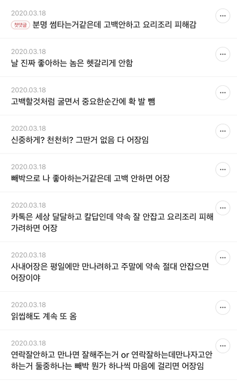작성자마제또 작성시간 22.04.20 내 경험상 최대 세번까지 개인만남가졌는데 고백안하면 어장남이였음