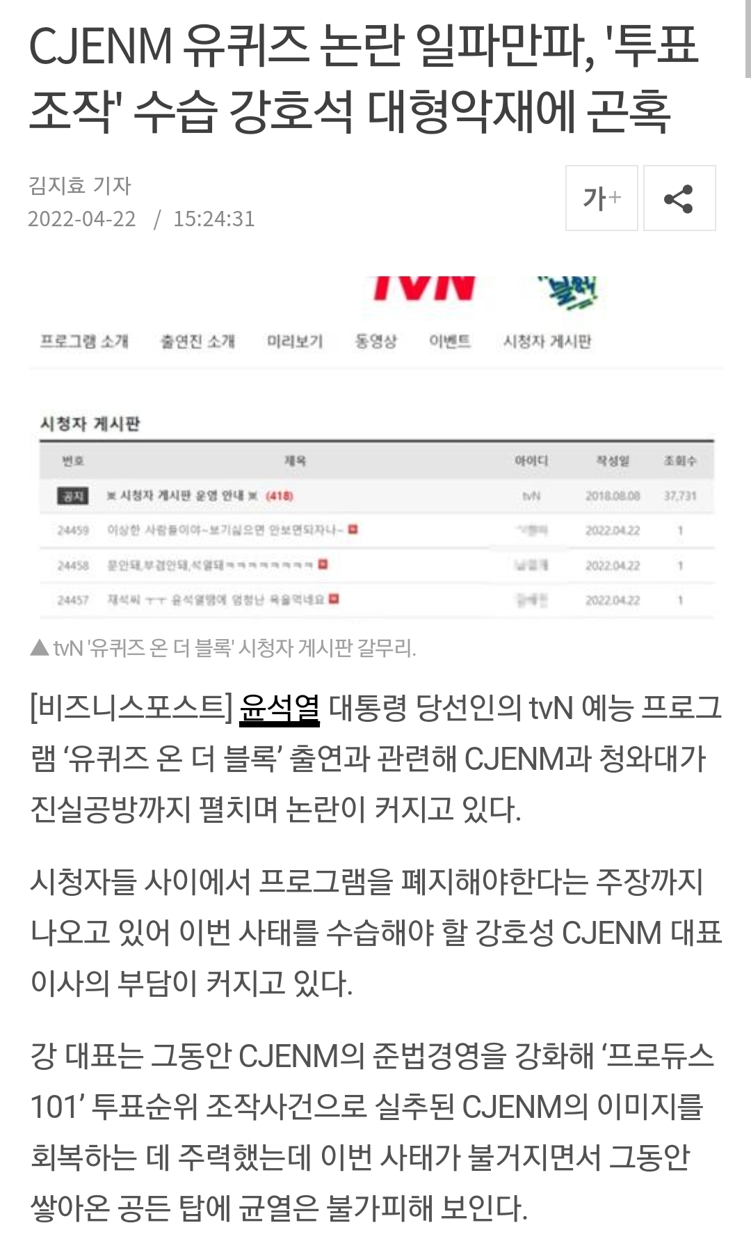 [여시뉴스데스크]CJENM 유퀴즈 논란 일파만파, '투표조작' 수습 강호석 대형악재에 곤혹 작성자체끼아웃|작성시간22.04.22|조회수2,211 목록 댓글 4 글자크기 작게가 글자크기 크게가 출처 : http://m.businesspost.co.kr/BP?command=mobile_view&idxno=278671 전문은 출처로.. 다음검색 현재 게시글 추가 기능 열기 북마크 공유하기 신고 센터로 신고 댓글 댓글 4 댓글쓰기 답글쓰기 댓글 리스트 작성자대통령 문재인 | 작성시간 22.04.22 맞다 티빙해지하러가야지 작성자좌파게티마싯다 | 작성시간 22.04.22 알빠야~티빙이나 해지해야지~ 알아서 잘 해결해보슈 작성자초코가외로워쿠키를찾네 | 작성시간 22.04.22 알아서하셔 작성자춘식이에게 물어봐 | 작성시간 22.04.22 검사출신이었어? 참나ㅋㅋㅋㅋㅋㅋ 댓글 전체보기