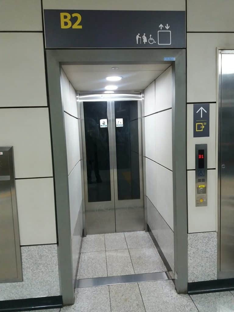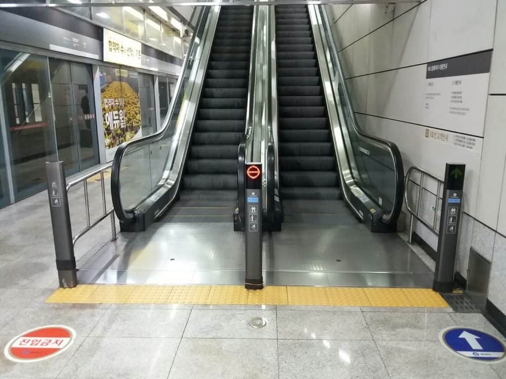 지하철 역사 승강기와 관련한 법령은 국토교통부가 고시한 ‘도시철도 정거장 및 환승‧편의시설 설계 지침’에서 확인할 수 있다. 그중 「3.6 교통약자시설」 부분의 11번 엘리베이터 설치기준 8항에선 “엘리베이터 전면에는 휠체어 사용자의 승강을 위해서 1.5m×1.5m 이상의 유효공간을 확보한다.”라고 규정한다. 문제는 해당 행정규칙이 2008년도부터 도입되었고, 9호선 양천향교역은 2009년 개통 약 5년 전부터 설계되었으므로 규칙과 관계없는 상태로 설치되었다는 것을 증명한다. 실제로 일주일 후 양천향교역을 다시 찾아서 엘리베이터와 에스컬레이터의 폭을 직접 측정한 결과 에스컬레이터가 넓고, 엘리베이터가 좁았는데 입구 폭이 1.031m(약 104cm), 승강구 가까이 접근해서 측정하면 0.891m(약 90cm)로 행정규칙에서 정한 1.5m(150cm) 기준보다 50~60cm가 부족하다는 것을 알 수 있었다.
