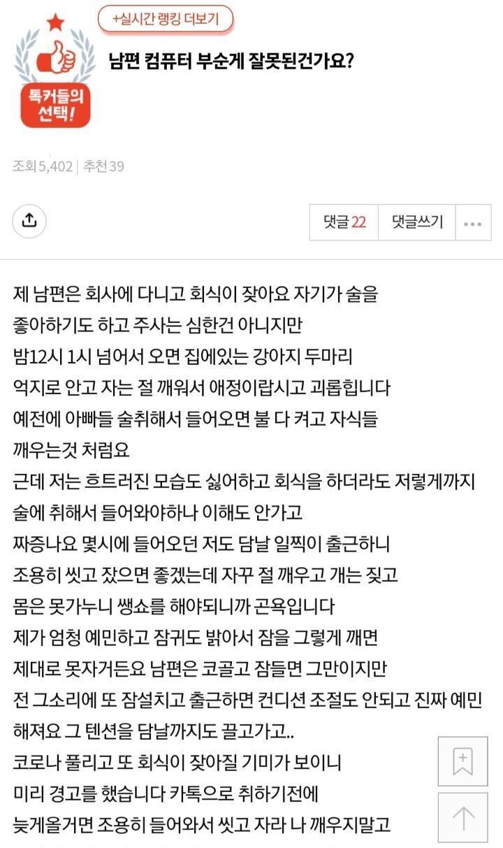 작성자밍밍블루 작성시간 22.04.23 남편새끼 안패죽인걸 감사해야지 진심 뚝배기 갈라버려