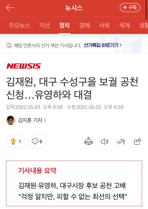 김 전 최고위원은 3일 오후 자신의 페이스북을 통해 "고심 끝에 수성구을 지역구 국회의원 보궐선거에 국민의힘 공천을 신청했다"고 밝혔다.