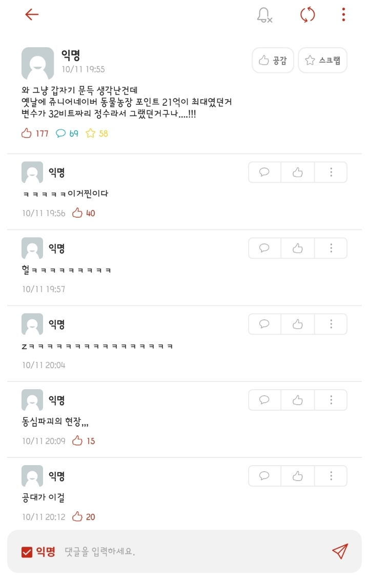 [스크랩] [흥미돋]쥬니어네이버 동물농장 최대포인트가 21억인 이유 작성자던트북스|작성시간22.05.04|조회수17,794 목록 댓글 13 글자크기 작게가 글자크기 크게가 출처 : 여성시대 던트북스 다들 이해했지? 그거잖아지금보니 그거네아무튼 그거네 다음검색 스크랩 원문 : *여성시대* 차분한 20대들의 알흠다운 공간 현재 게시글 추가 기능 열기 북마크 공유하기 신고 센터로 신고 댓글 댓글 13 댓글쓰기 답글쓰기 댓글 리스트 작성자일움미낟띠 | 작성시간 22.05.04 어.어 보석상이 손햬. 어 어 어 끈어. 작성자닉네임에는 이모지, | 작성시간 22.05.04 짜증나 작성자윤열석사테하라 | 작성시간 22.05.04 붑치박치붑치디 췯췩~~ 작성자연봉2억 | 작성시간 22.05.04 음….ㅋㅋ 작성자서대문구 | 작성시간 22.05.04 치즈오메틱 댓글 전체보기