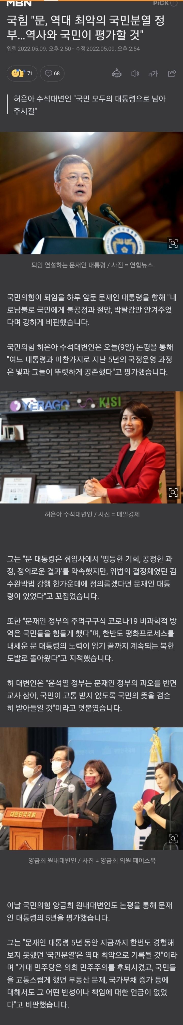 [여시뉴스데스크]국힘 "문, 역대 최악의 국민분열 정부…역사와 국민이 평가할 것" 작성자준석아ㅡㅡ|작성시간22.05.09|조회수2,249 목록 댓글 56 글자크기 작게가 글자크기 크게가 출처 : http://naver.me/FoW5RktL국힘 "문, 역대 최악의 국민분열 정부…역사와 국민이 평가할 것"국민의힘이 퇴임을 하루 앞둔 문재인 대통령을 향해 "내로남불로 국민에게 불공정과 절망, 박탈감만 안겨주었다며 강하게 비판했습니다. 국민의힘 허은아 수석대변인은 오늘(9일) 논평을 통해 "n.news.naver.com 다음검색 현재 게시글 추가 기능 열기 북마크 공유하기 신고 센터로 신고 댓글 댓글 56 댓글쓰기 답글쓰기 댓글 리스트 작성자아우스트레스좀안받를래 | 작성시간 22.05.10 ㄲㅈ 작성자정청램 | 작성시간 22.05.10 진짜 개짜증나네 작성자두두호 | 작성시간 22.05.10 엥 자기소개 작성자제주처돌이 | 작성시간 22.05.10 말하는 거 봐... 재수없어 작성자블루이 | 작성시간 22.05.10 분열시키는거 국힘당이 하는거잖아 댓글 전체보기